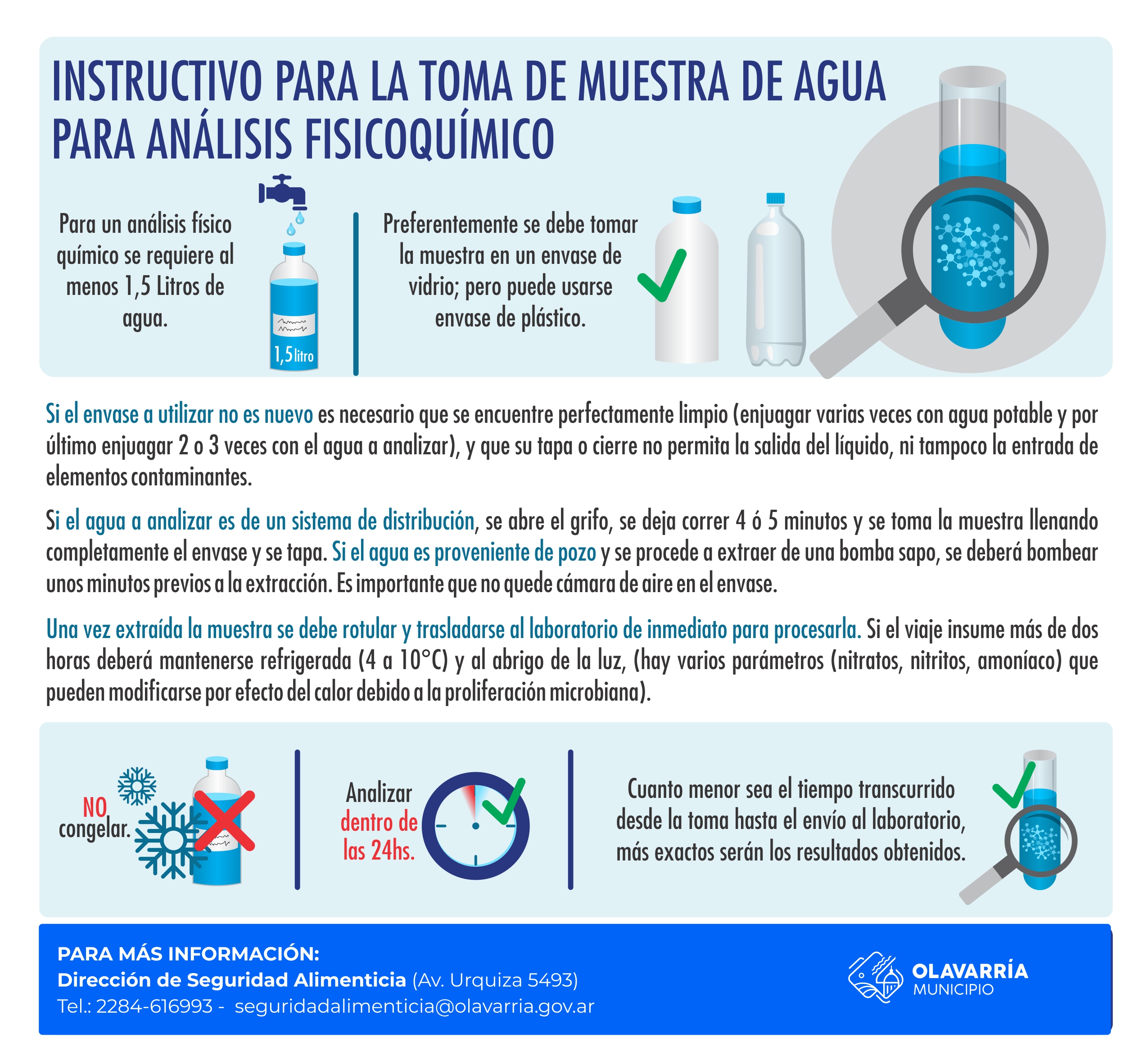 IMPORTANTE: La cantidad de agua necesaria es de al menos un litro y medio; se debe tomar la muestra en botellas de plástico limpias (bien lavadas y enjuagadas tres veces con el agua a analizar), sin dejar cámara de aire.