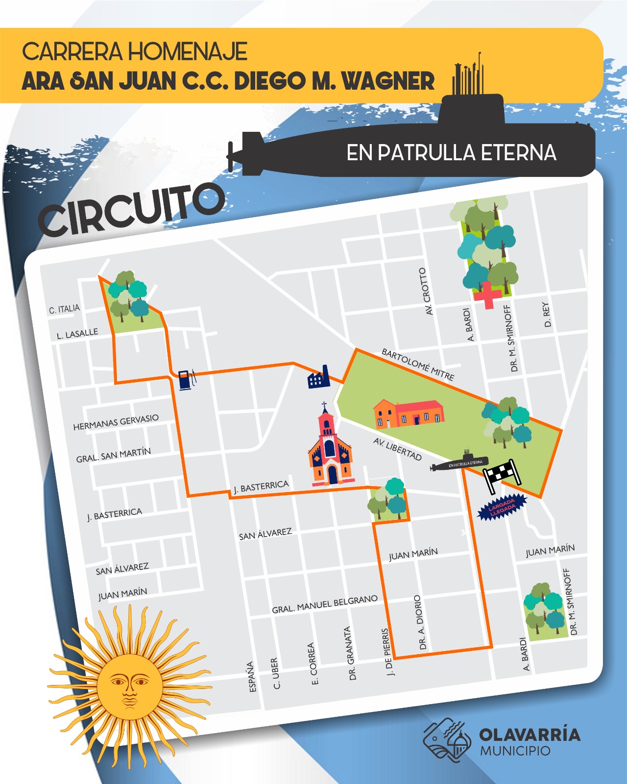 - La largada será el Domingo 16/11 a las 10 hs. en la intersección de la av. Crotto y av. Libertad donde se encuentra el monumento submarino ARA San Juan.